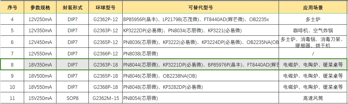 在電源管理領(lǐng)域,非隔離buck芯片扮演著至關(guān)重要的角色,尤其是在小家電市場中。G2363P-18作為一款高性能的非隔離buck芯片,以其18V350mA的輸出能力,廣泛應(yīng)用于電磁爐等設(shè)備。然而,在實(shí)際應(yīng)用中,工程師們可能會(huì)尋找替代型號(hào)以滿足特定的設(shè)計(jì)需求或成本考慮。以下是G2363P-18的一些可替代型號(hào)及其特點(diǎn)分析。