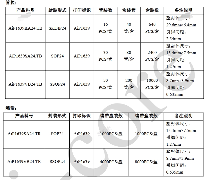 AiP1639KA24.TB:采用SKDIP24封裝形式,適用于需要較大引腳間距的應用場景。其塑封體尺寸為29.6mm×6.4mm,引腳間距為2.54mm。