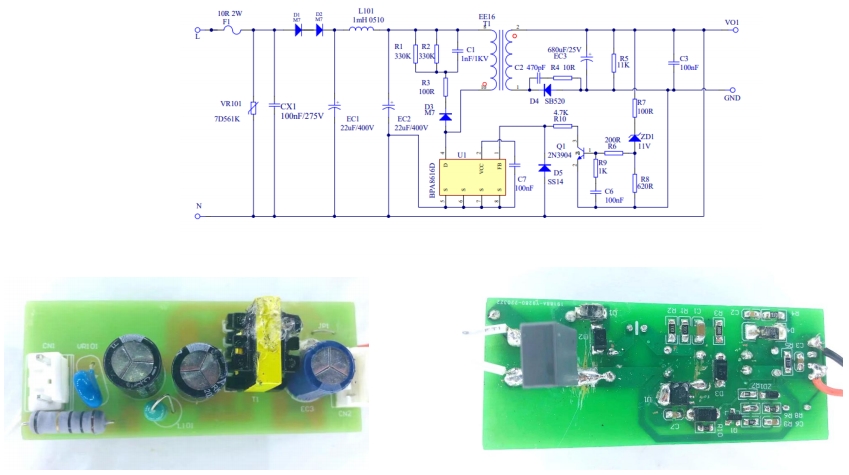 輸出整流濾波電路由肖特基二極管D4和電解電容EC3組成,將高頻脈沖電壓整流為穩(wěn)定的直流輸出電壓。反饋控制電路由光耦、穩(wěn)壓管ZD1和電阻R9等元件組成,用于檢測輸出電壓的變化,并將其反饋到BPA8616D芯片,以實現(xiàn)輸出電壓的穩(wěn)定調(diào)節(jié)。