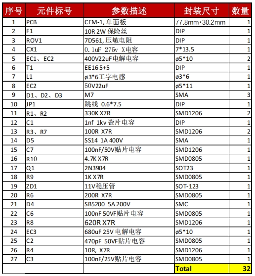 PCB設計是電源性能的重要保障。在本設計中,PCB采用CEM-1單面板,尺寸為77.8mm×30.2mm。在布局上,輸入端和輸出端盡量遠離,以減少干擾。高頻元件如變壓器、MOSFET等盡量靠近電源芯片,以縮短走線長度,降低寄生參數(shù)的影響。同時,合理安排地線和電源線的布局,確保電源的穩(wěn)定性和可靠性。