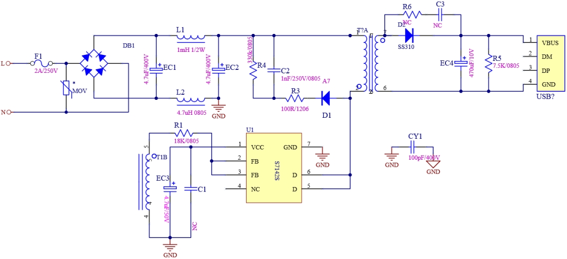 S7142S的參考設計采用了先進的電路架構,確保了電源的高效轉換和穩定輸出。芯片內部集成了多種保護功能,如過壓保護、欠壓保護、過流保護等,這些功能不僅提高了電源的安全性,還延長了設備的使用壽命。此外,S7142S還具備低待機功耗的特性,其空載待機功耗小于100mW,這使得它在節能方面表現出色,符合現代電子設備對環保和能效的要求。