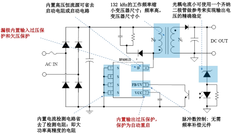 在設(shè)計(jì)細(xì)節(jié)上,BPA861X 也展現(xiàn)出了諸多優(yōu)化之處。它內(nèi)置了高壓恒流源,可以省去啟動(dòng)電阻或啟動(dòng)電路,簡(jiǎn)化了外圍電路設(shè)計(jì),降低了成本。同時(shí),BPA861X 還內(nèi)置了電流檢測(cè)電路,省去了檢測(cè)電阻,這不僅減少了外圍元件數(shù)量,還提高了檢測(cè)精度和可靠性。相比之下,友商產(chǎn)品在這些方面往往需要額外的外圍元件來實(shí)現(xiàn)相同的功能,這不僅增加了設(shè)計(jì)復(fù)雜度和成本,還可能因元件數(shù)量的增加而降低系統(tǒng)的可靠性。