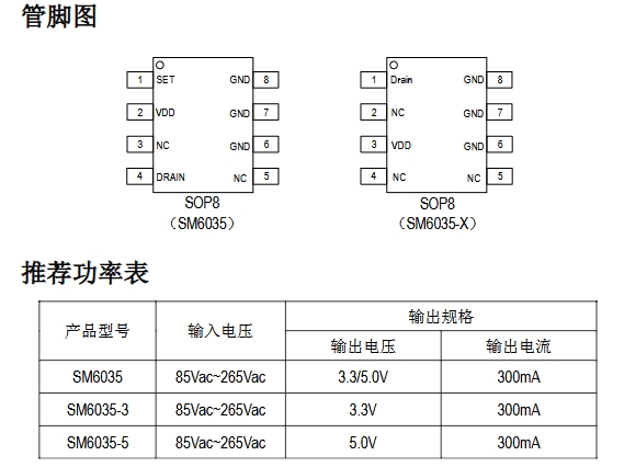 SM6035采用SOP8封裝形式,具有體積小、散熱性能好等特點(diǎn),非常適合緊湊型電源設(shè)計(jì)。