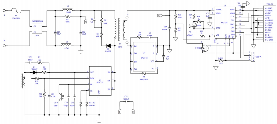 在當今快速發展的電子設備市場中,電源適配器的性能和效率對于設備的穩定運行至關重要。隨著USB-C接口和USB-PD協議的廣泛應用,市場對高性能、高效率的電源適配器的需求日益增加。本文將詳細介紹基于BP87112和BP6211B芯片的20W A+C電源適配器參考設計,該設計支持12V/1.67A、9V/2.22A和5V/3A的輸出規格,旨在為用戶提供一個高效、可靠的電源解決方案。
