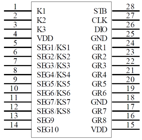 • DIO、CLK和STB引腳:這些引腳用于與外部微控制器進行通信。DIO引腳用于數(shù)據(jù)傳輸,CLK引腳用于時鐘信號,STB引腳用于片選信號。確保這些引腳的連接正確,以實現(xiàn)穩(wěn)定的數(shù)據(jù)傳輸。