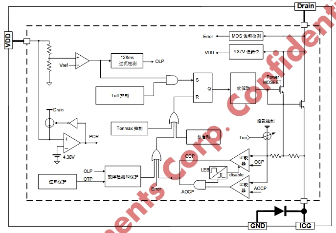• 逐周期電流限制:芯片內(nèi)部差分采樣電路采樣流經(jīng)高壓 MOSFET 的電流,當(dāng)電流超過設(shè)定閾值時,MOSFET 立即關(guān)斷,直至下一個周期重新開通。