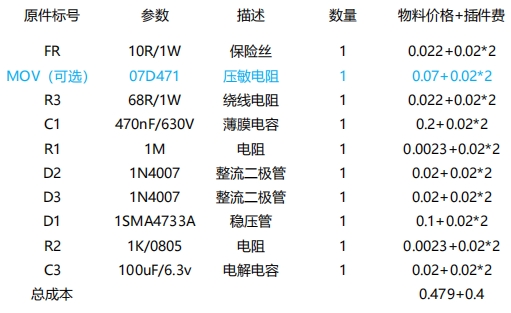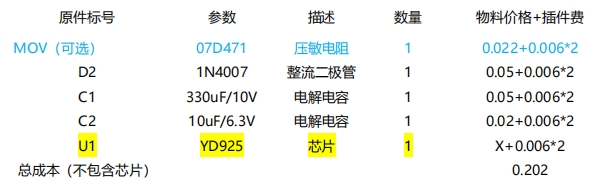 從 BOM 方案及成本來(lái)看,YD925 方案的物料種類(lèi)大幅減少,且大多為貼片元件,尺寸小,可實(shí)現(xiàn)全貼片加工,極大地降低了生產(chǎn)成本和體積。以一個(gè)典型的 5V 輸出供電方案為例,YD925 的外圍電路簡(jiǎn)潔明了,主要包括壓敏電阻(可選)、整流二極管、電解電容等常見(jiàn)元件,總成本(不包含芯片)僅為 0.202 元,相比傳統(tǒng)阻容降壓方案的 0.479+0.4 元,成本優(yōu)勢(shì)不言而喻。