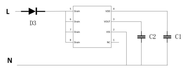 | 5,6,7,8 | Drain | 電源 | 內(nèi)部功率MOSFET漏極,為VDD供電 |