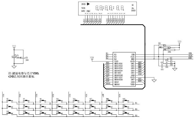 顯示驅動電路:包括SEG1-SEG10和GR1-GR8引腳,用于驅動LED顯示屏。SEG引腳為段輸出,GR引腳為位輸出。