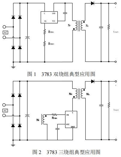 三繞組應用是3783系列芯片的另一種典型應用方式,其典型應用電路如圖2所示。在這種應用中,3783芯片的FB腳通過變壓器輔助繞組和FB腳的外置電阻反饋輸出電壓,與內部基準比較形成閉環,從而恒定輸出電壓。