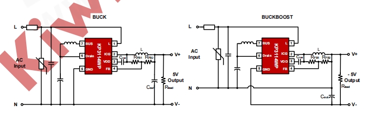 KP3114WPA適用于多種小功率電源應用,如小家電電源、USB充電器等。以下是兩種典型的電路應用示例: