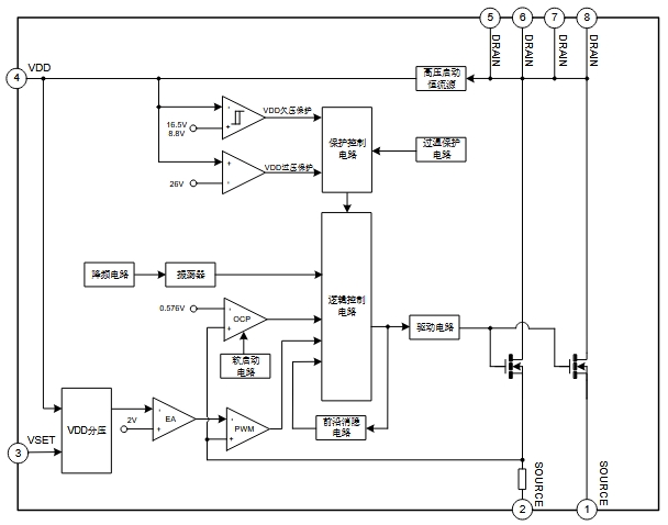• 內置700V高壓啟動電路:無需外接啟動電阻,簡化設計。