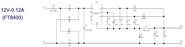 FT8400是一款可調節輸出電壓的AC-DC恒壓芯片,支持5V、9V、12V等多種輸出電壓。其典型電路如下圖所示: