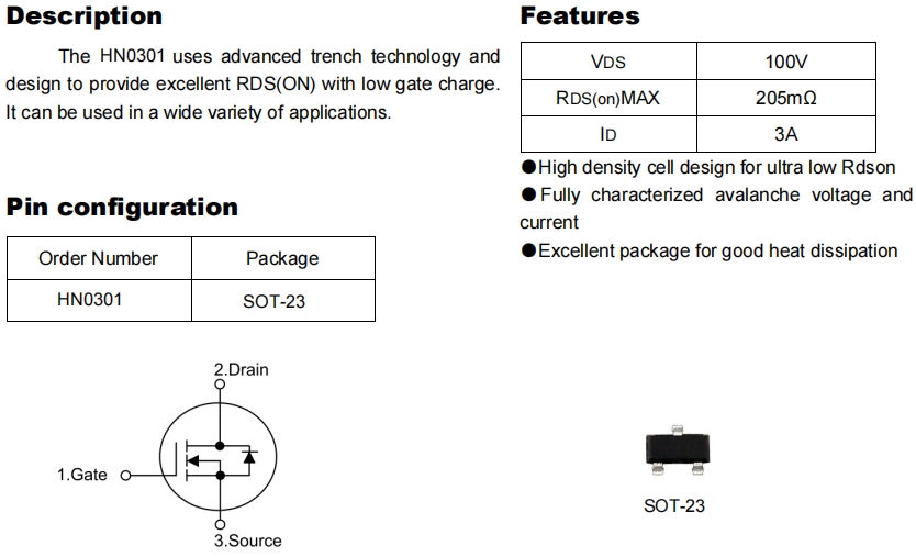 在 60 W 以下的開關電源、馬達驅動或電池保護板上,工程師往往希望找到一顆“既耐壓又高開關速度、同時封裝足夠小”的 MOSFET。華能(HN)推出的 HN0301 把 100 V 耐壓、205 mΩ 低導通電阻和 3 A 連續電流塞進了一顆 SOT-23 三腳小封裝,成為 24 V 工業母線、12 V/24 V 汽車周邊、POE 受電設備等場景的新寵。本文結合原廠數據表與實測筆記,帶你1分鐘吃透這顆“迷你功率管”。