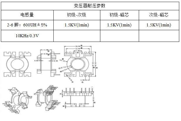 電感量LP 600 μH ±5 %,漏感<30 μH(5 %),氣隙0.15 mm(PC40材質,研磨中間柱)