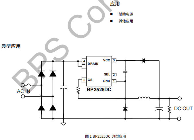 ACin → 1 A/500 V整流橋 → 4.7 μF/400 V電解 → BP2525DC DRAIN;