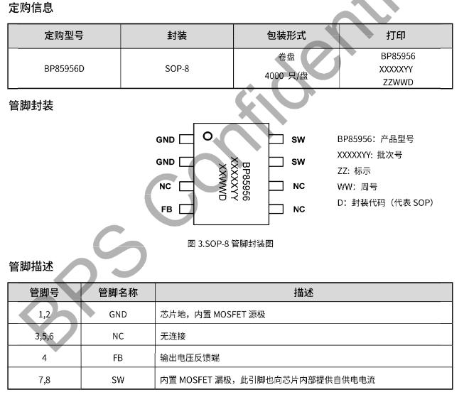 SOP-8封裝,絲印“BP85956D”下面還有一行小字“YYWWX”,內(nèi)部批次碼。管腳定義如下(頂視圖逆時(shí)針):