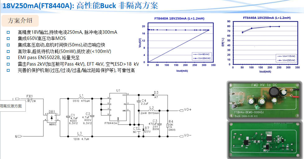 | 非隔離 Buck | 18V/250mA | 86%@230V | 1.2mH 電感 | 32×20mm | FT8440A |