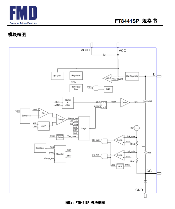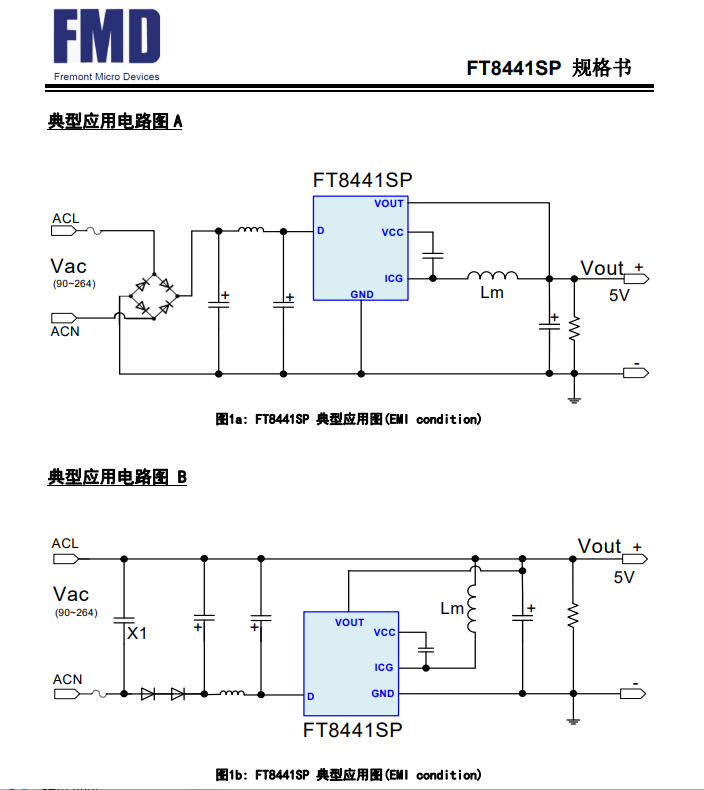 FT8441SP采用極高壓技術,通過內(nèi)置高壓啟動電路、高壓功率MOSFET開關以及電流采樣電阻,減少了外圍元器件,大大的簡化了系統(tǒng)應用。內(nèi)置的抖頻和軟驅動技術有效的提高了EMI性能。