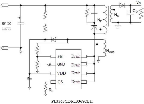PL3368CE同時具有多種保護功能:逐周期峰值電流檢測、VDD 欠壓/過壓保護、輸出過壓保護、輸出短路保護和過溫保護等。