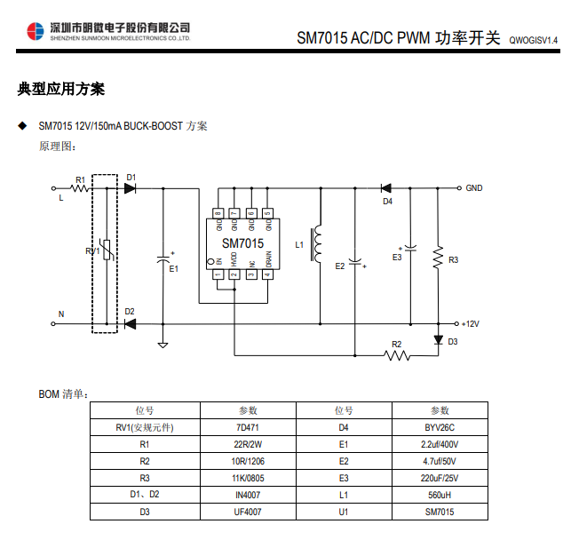 SM7015 是采用電流模式 PWM 控制方式的功率開關(guān)芯片,集成高壓?jiǎn)?dòng)電路和高壓功率管,為低成本開關(guān)電源系統(tǒng)提供高性價(jià)比的解決方案。芯片應(yīng)用于 BUCK 系統(tǒng)方案,支持 12V/18V 輸出電壓,很方便的應(yīng)用于小家電產(chǎn)品領(lǐng)域。并提供了過(guò)溫、過(guò)流、過(guò)壓、欠壓等完善的保護(hù)功能,保證了系統(tǒng)的可靠性。