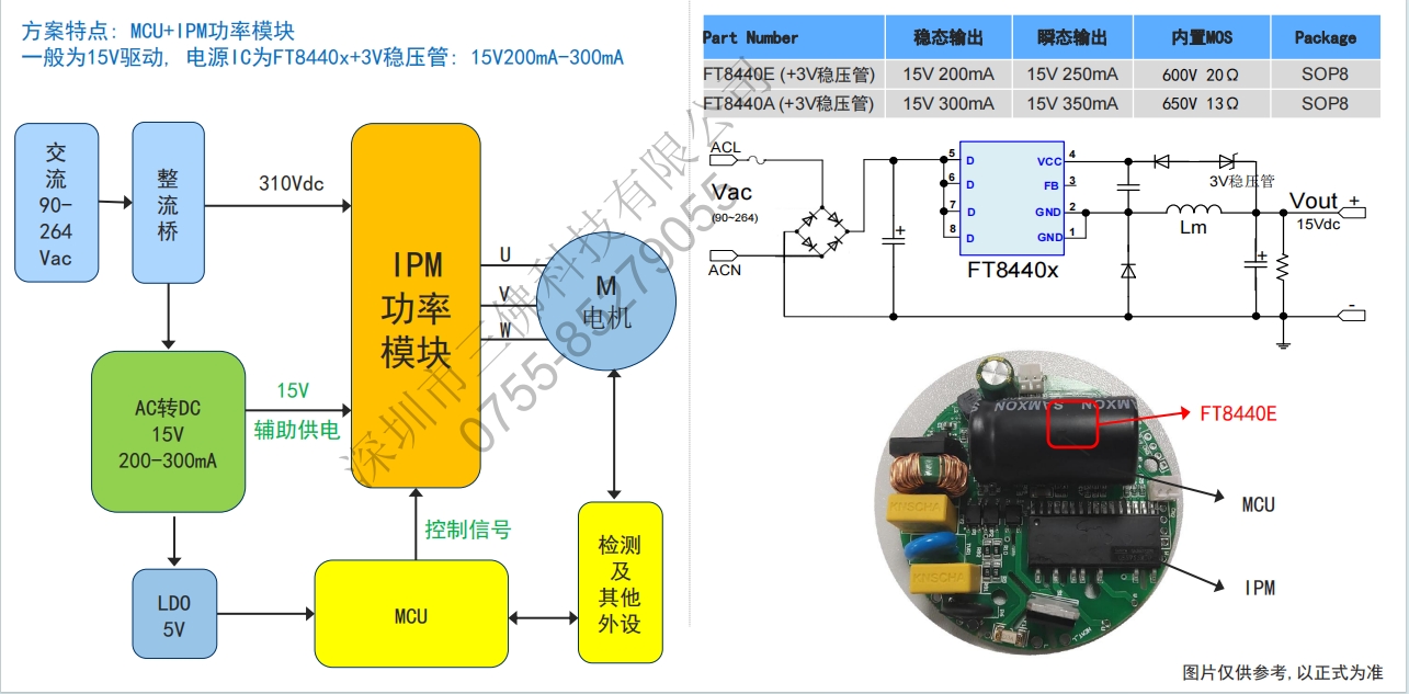 方案特點:MCU+IPM功率模塊一般為15V驅動,電源1C為FT8440x+3V穩壓管:15V200mA-300mA