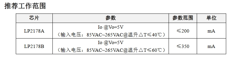 LP2178A在5V輸出電壓下,輸入電壓范圍為85VAC至265VAC,溫升△T≤40℃時,輸出電流能力為≤200mA。LP2178B在相同條件下,輸出電流能力為≤400mA,是LP2178A的兩倍,適合需要更大輸出電流的應(yīng)用。