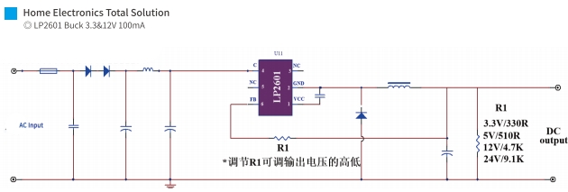 LP2601:適用于OR模式,輸出電壓可調的Buck降壓電路,推薦電壓為3.3V或5V,最大輸出電流可達100mA。這款芯片適合需要靈活電壓調節的應用場景。