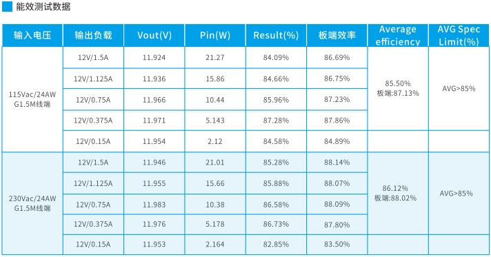 在230VAC輸入下,12V1.5A輸出時(shí),效率最高可達(dá)88.99%,平均效率為88.09%。