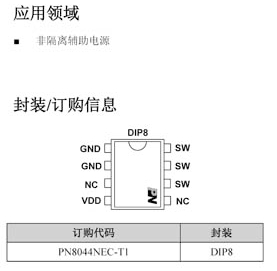 根據深圳三佛科技提供的資料,PN8044的后綴版本為"NEC-TI",這通常表示該芯片的封裝類型和可能的一些特定特性。在這個例子中,"NEC"可能代表"Non-isolated Evaluation Configuration",而"TI"可能是指"Through Hole Insertion",即通孔插入式封裝。封裝信息顯示,PN8044NEC-TI采用的是DIP8封裝。