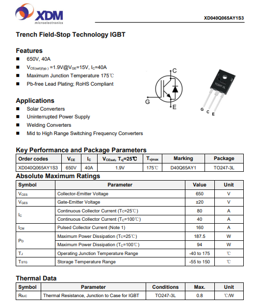 XD040Q065AY1S3芯達(dá)茂 國(guó)產(chǎn)IBGT +FRD單管 40A 650V TO-247-3L